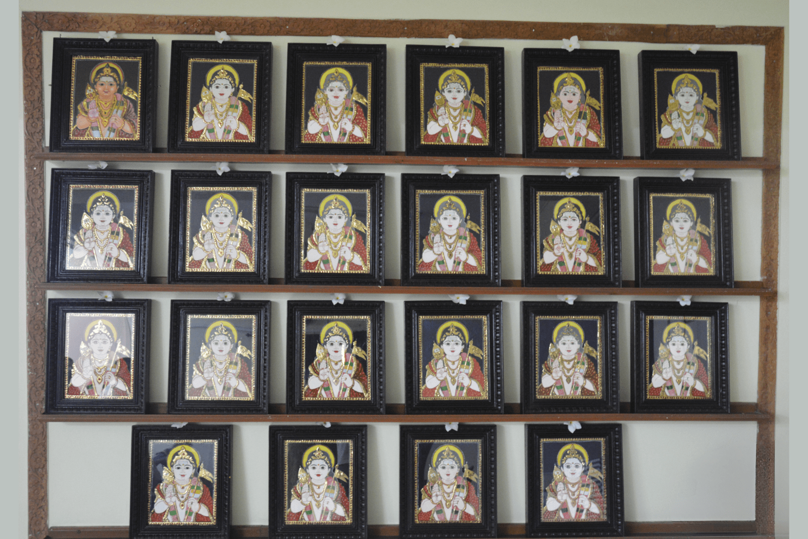 Thanjavur paintings are typically completed on boards made from jackfruit or teak wood. Common themes in paintings include Bal Krishna, Lord Rama, as well as other gods, goddesses, saints and subjects from Hindu mythology. The technique of painting demanded a great deal of perseverance and perfection from artists. Furthermore, the creation of the artwork, considered a sacred task, was to be performed with some degree of ritual purity and humility by the master craftsmen. Remaining true to the Indian artistic tradition, most artists chose to remain anonymous and never signed their paintings.